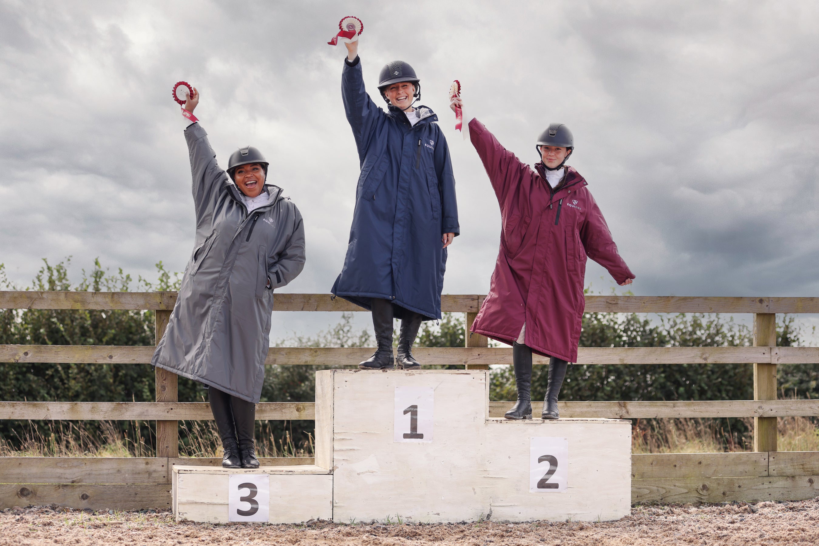 Evolution Pro women's Warm Waterproof Horse Riding Coat Thick Fleece Lining Stowaway Hood in Plum 3 riders on podium after show Evolution Pro women's Warm Waterproof Horse Riding Coat Thick Fleece Lining Stowaway Hood in Plum 3 riders on podium after show