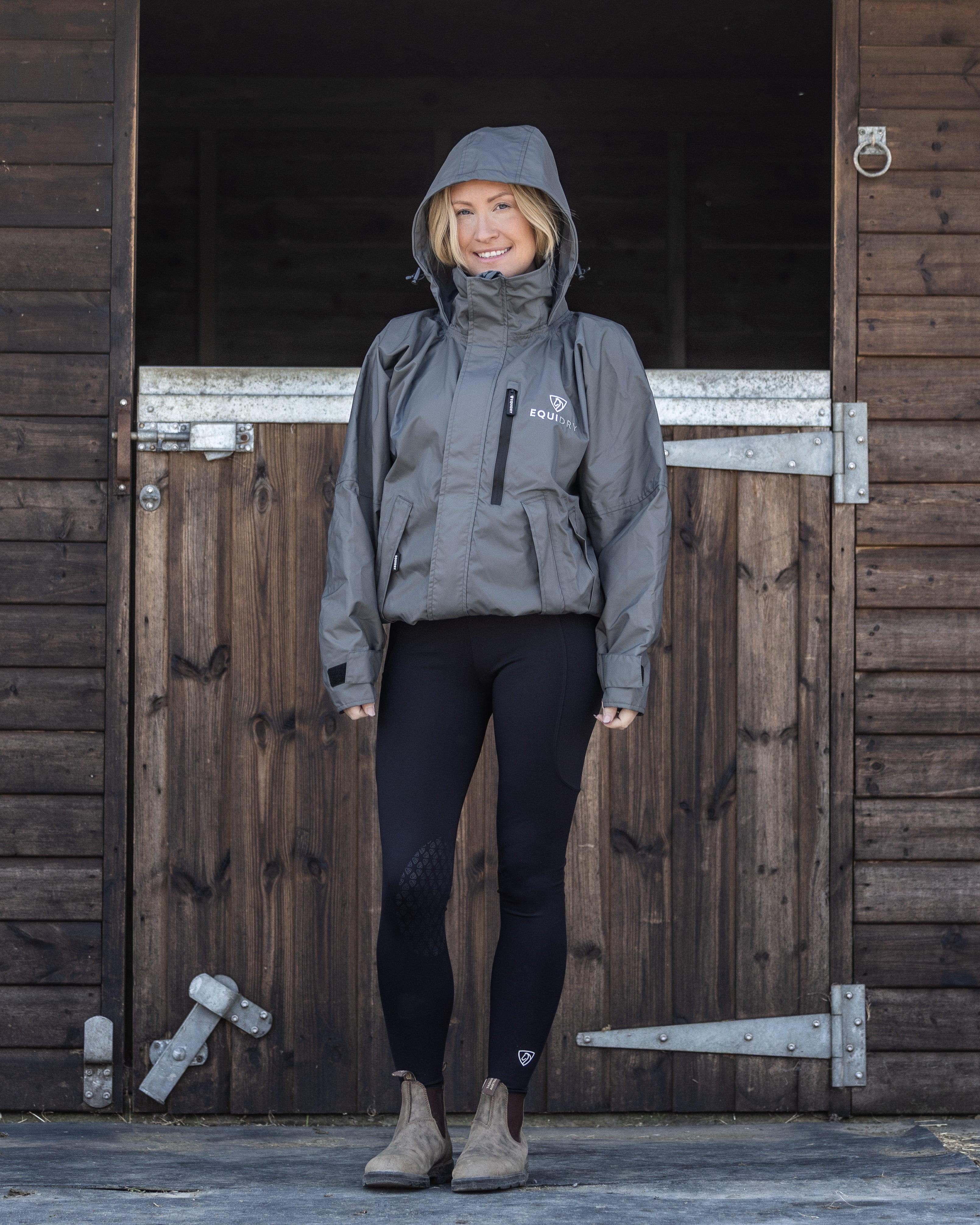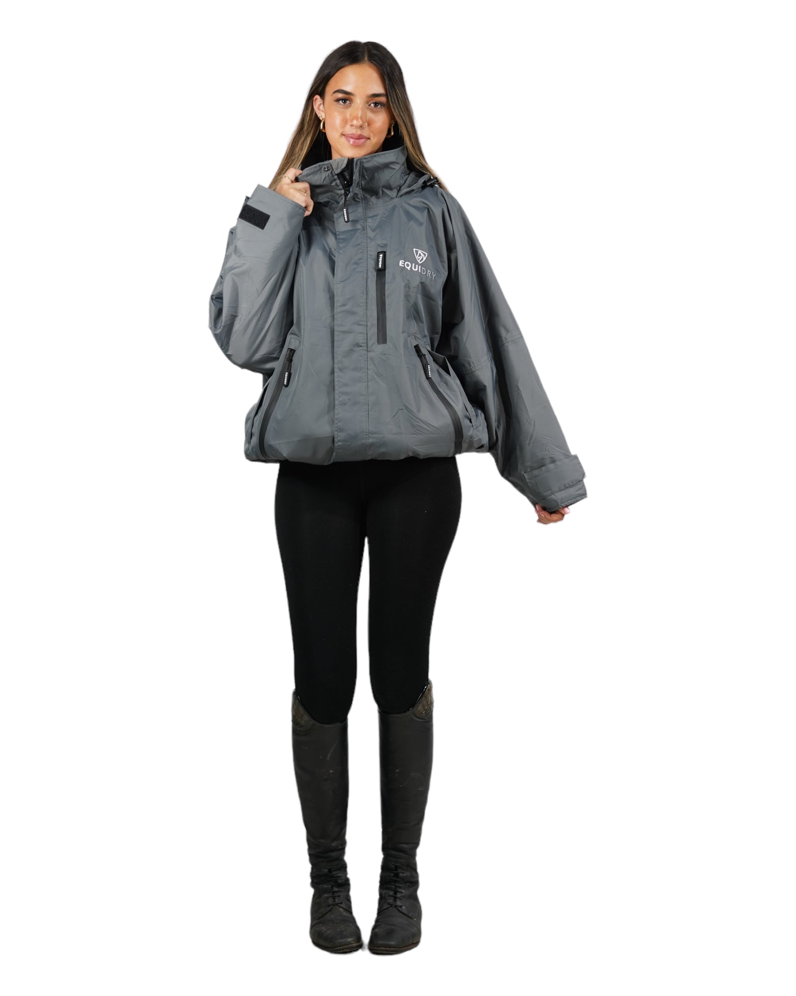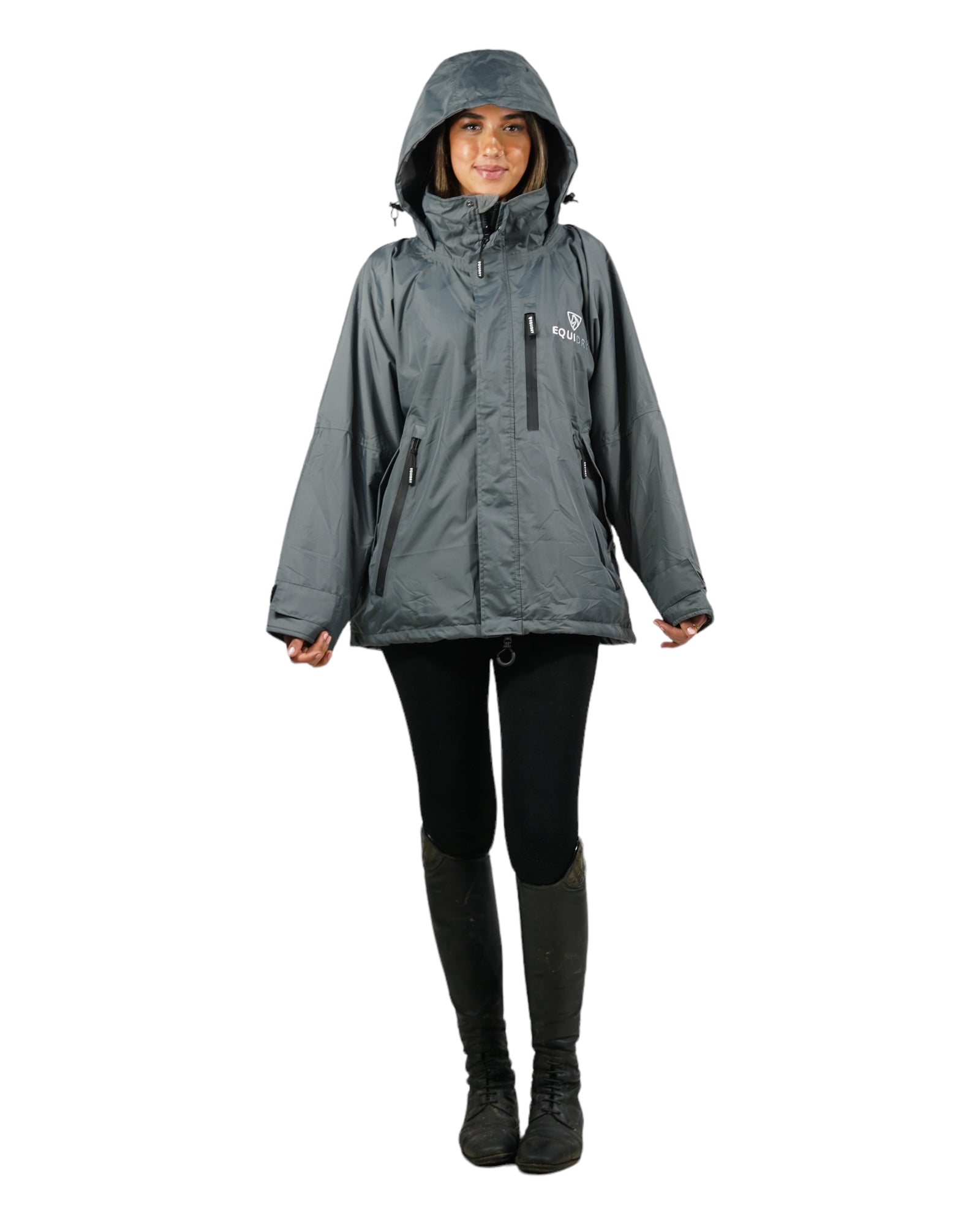 EQUIDRY women's waterproof short blouson style horse riding jacket in charcoal/grey front view hood up EQUIDRY women's waterproof short blouson style horse riding jacket in charcoal/grey front view hood up