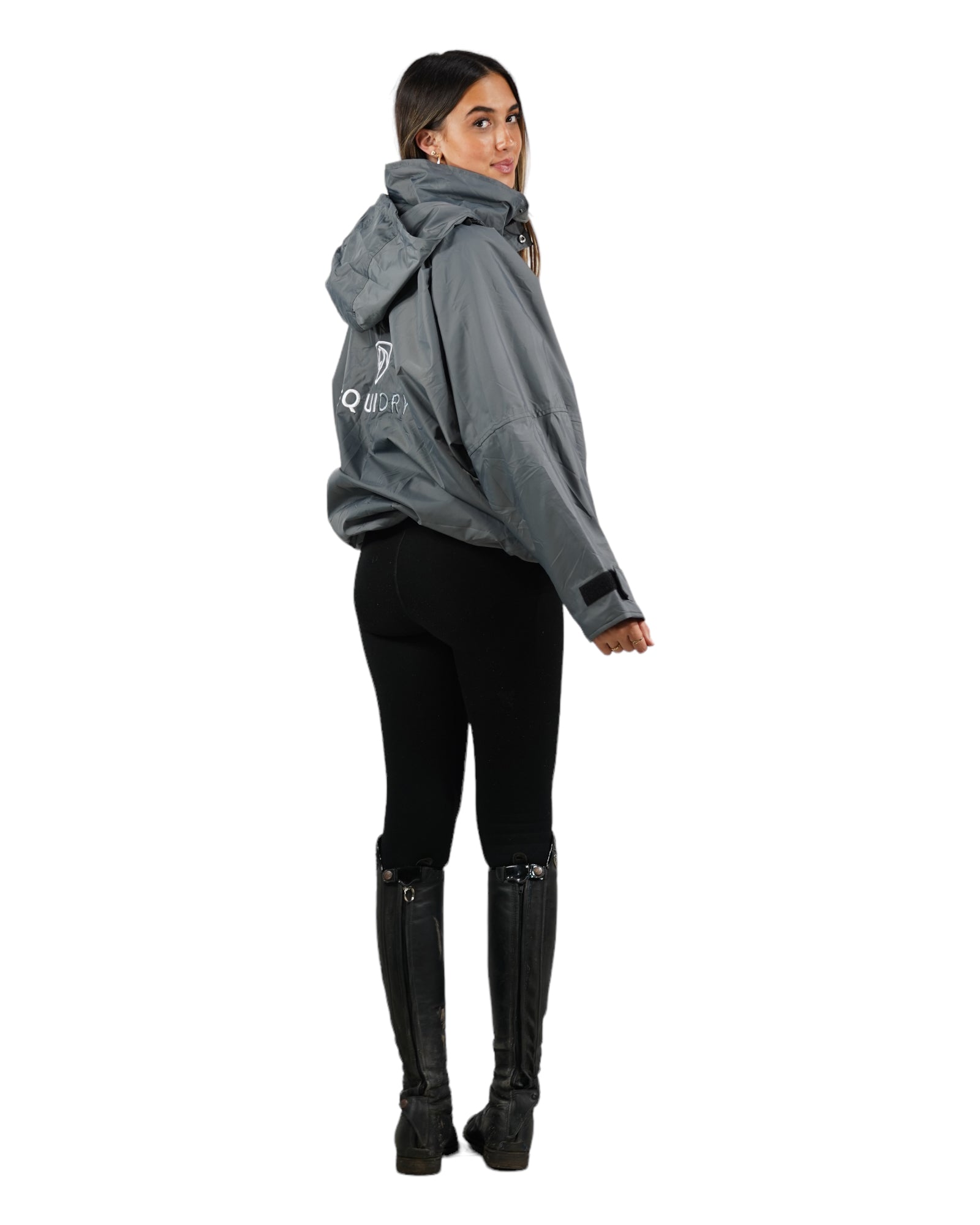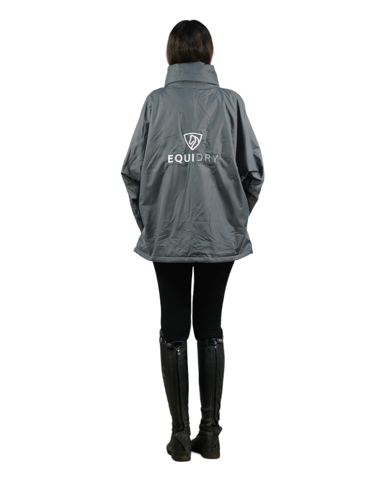 EQUIDRY women's waterproof short blouson style horse riding jacket in charcoal/grey studio back EQUIDRY women's waterproof short blouson style horse riding jacket in charcoal/grey studio back