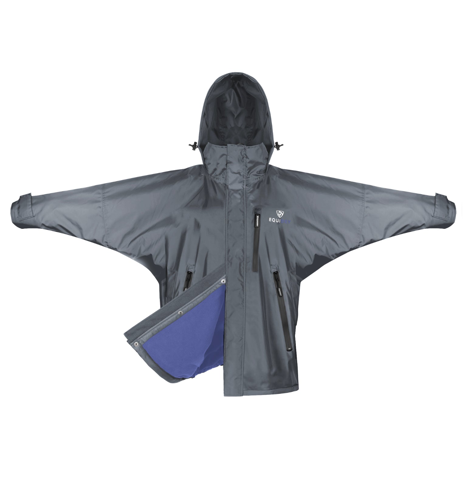 The adjustable stowaway hood is equipped with bungee toggles and a velcro strip for a customisable fit over most riding hats or a more conventional size when needed. When not required the hood stows away neatly in to the collar.