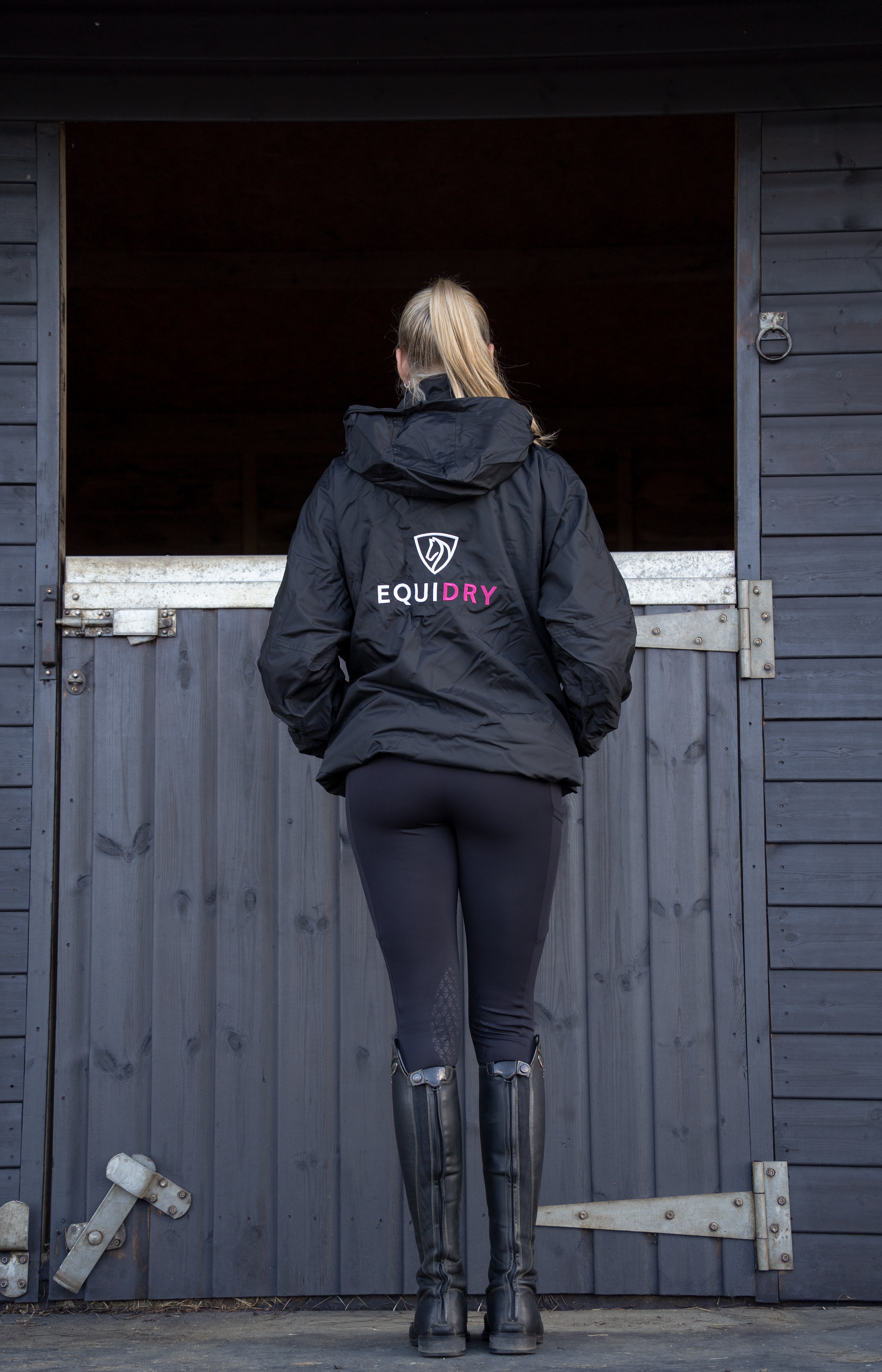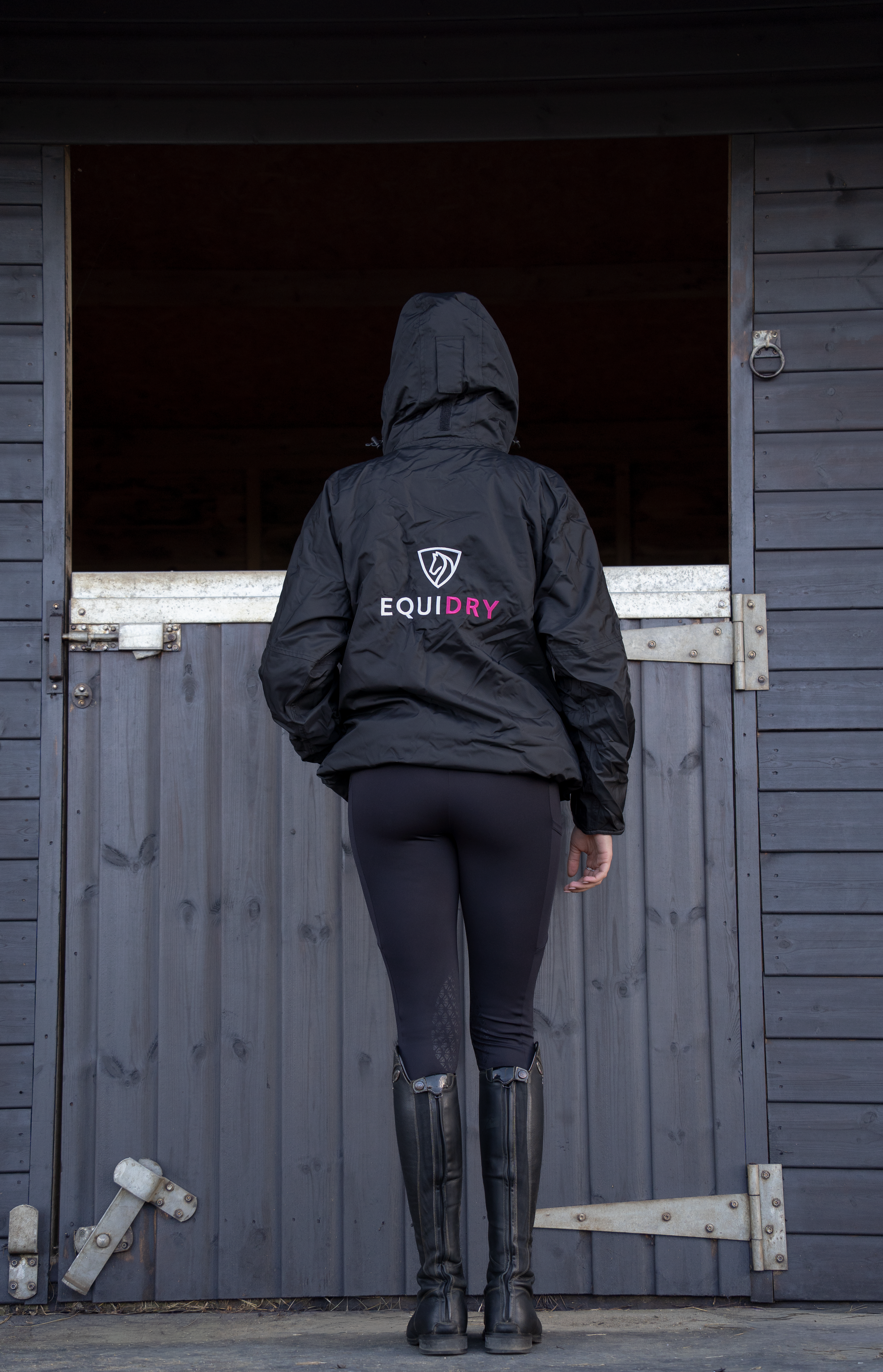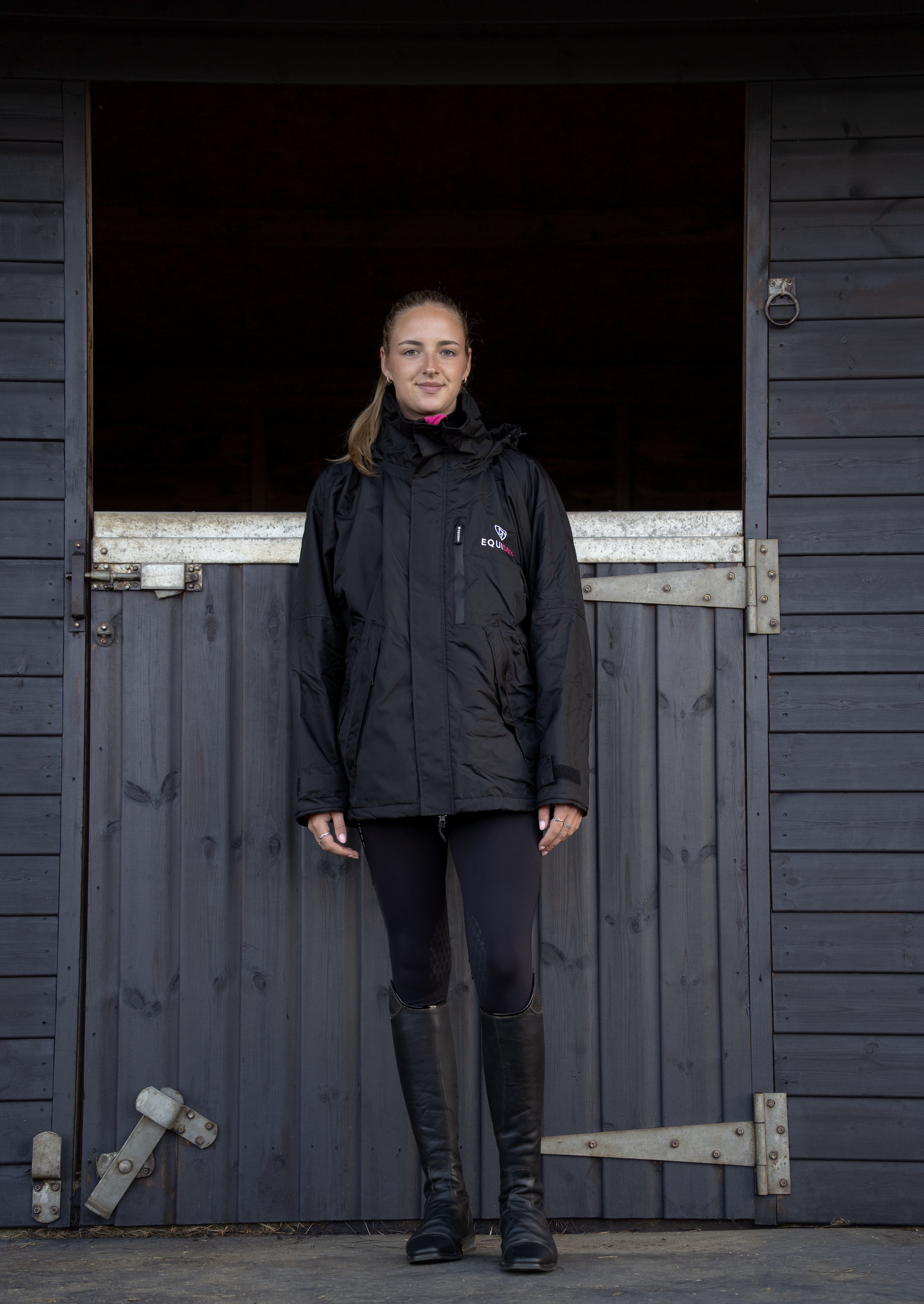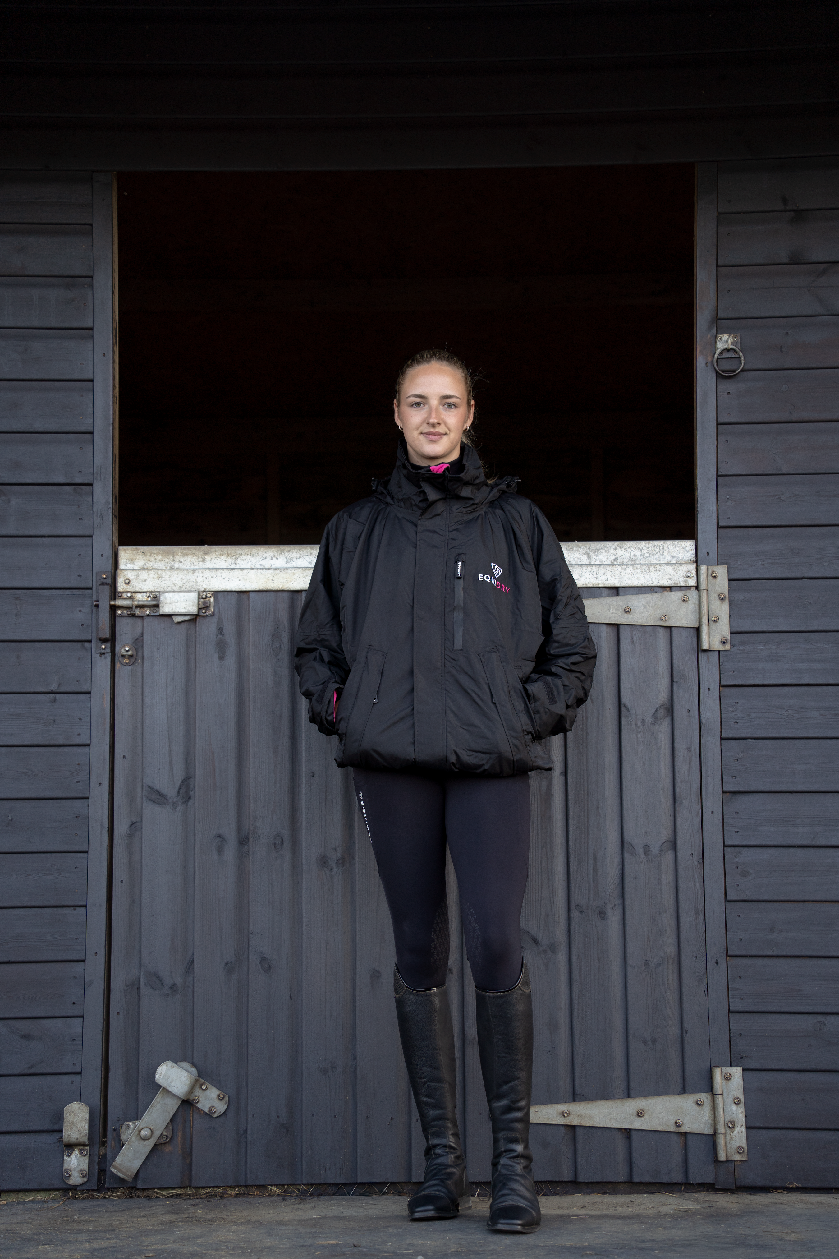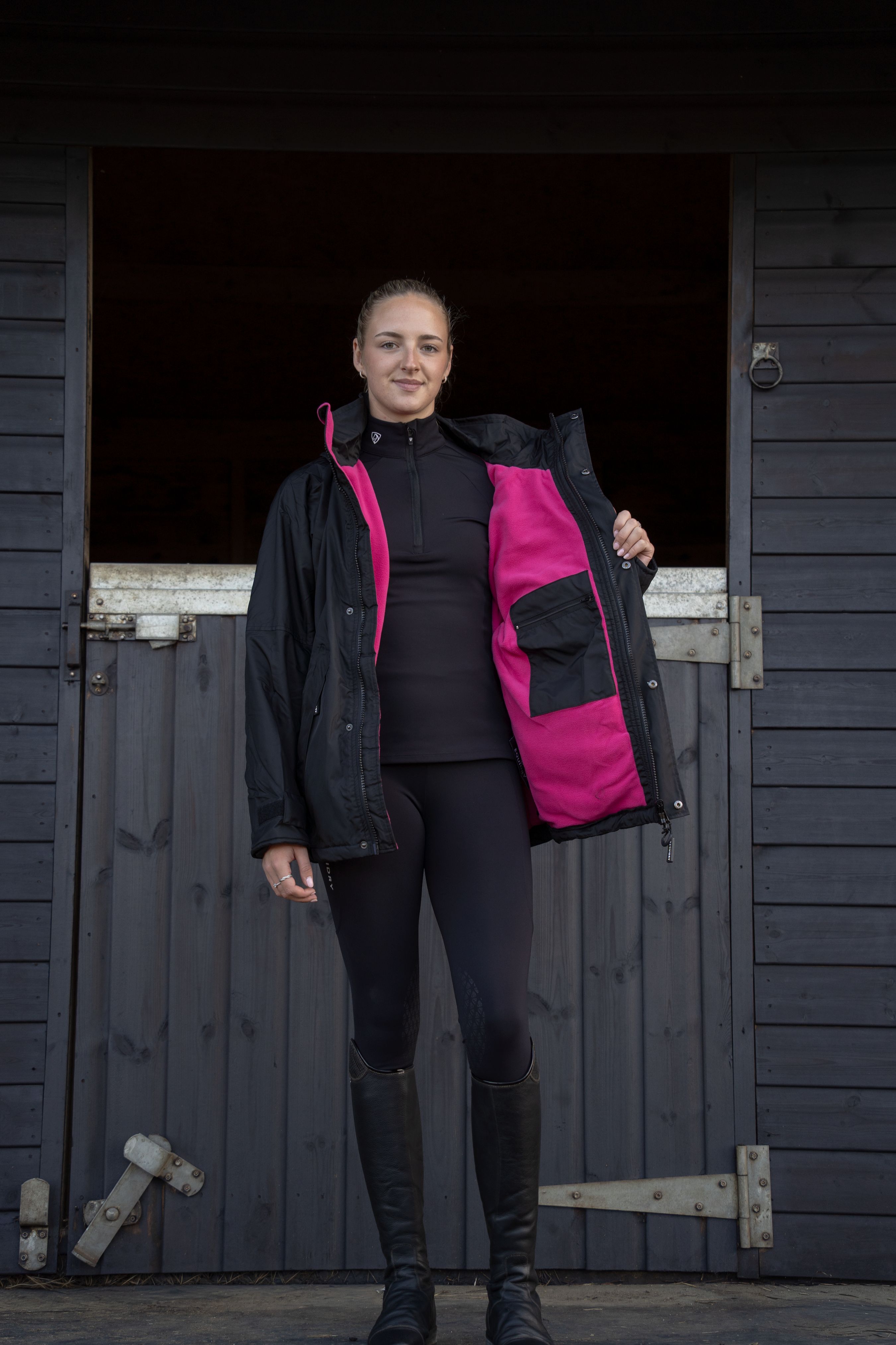 EQUIDRY women's waterproof short blouson style horse riding jacket in black/peacock pink with horse on the yard EQUIDRY women's waterproof short blouson style horse riding jacket in black/peacock pink with horse on the yard