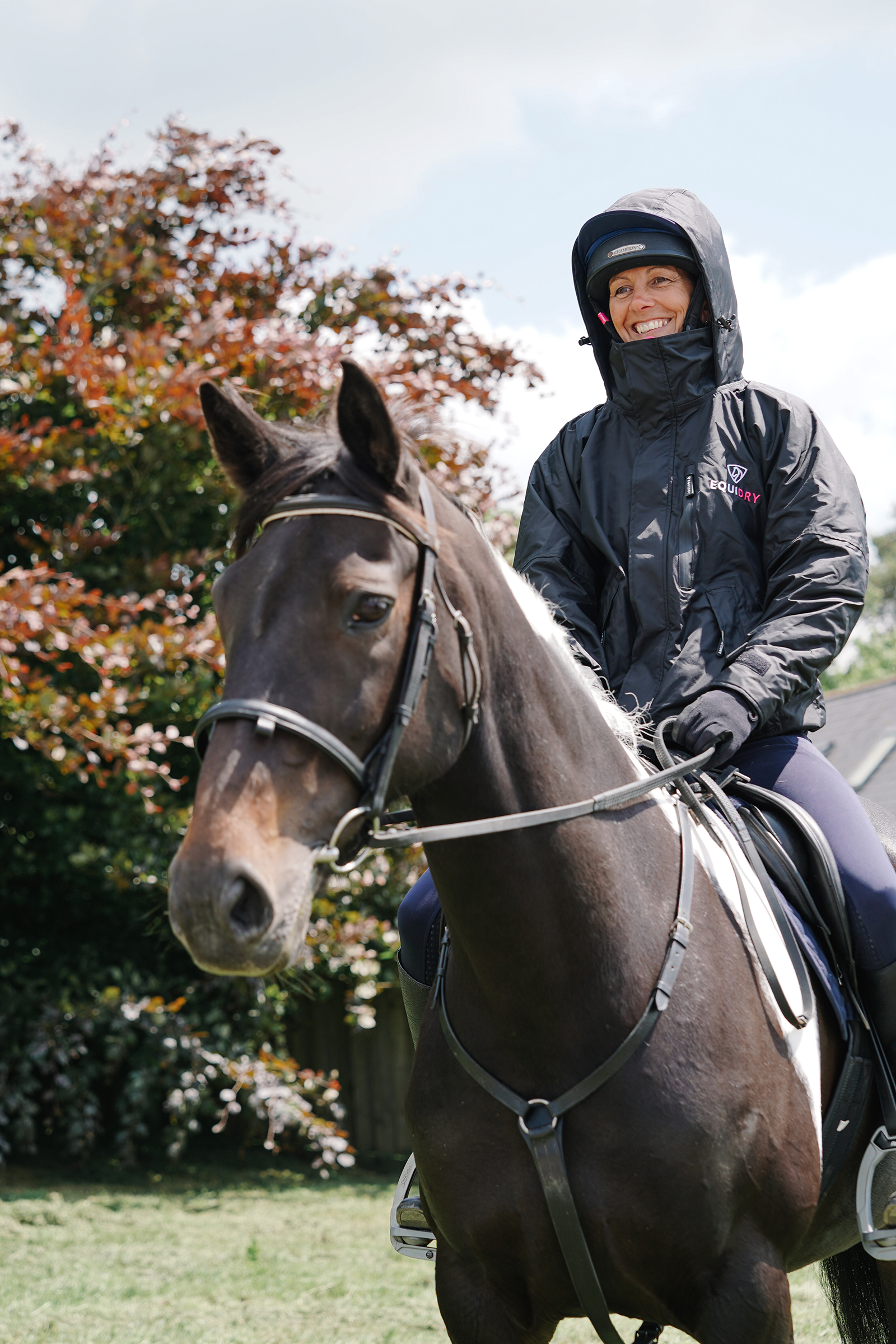 EQUIDRY women's waterproof short blouson style horse riding jacket in black/peacock pink being shown on horse EQUIDRY women's waterproof short blouson style horse riding jacket in black/peacock pink being shown on horse