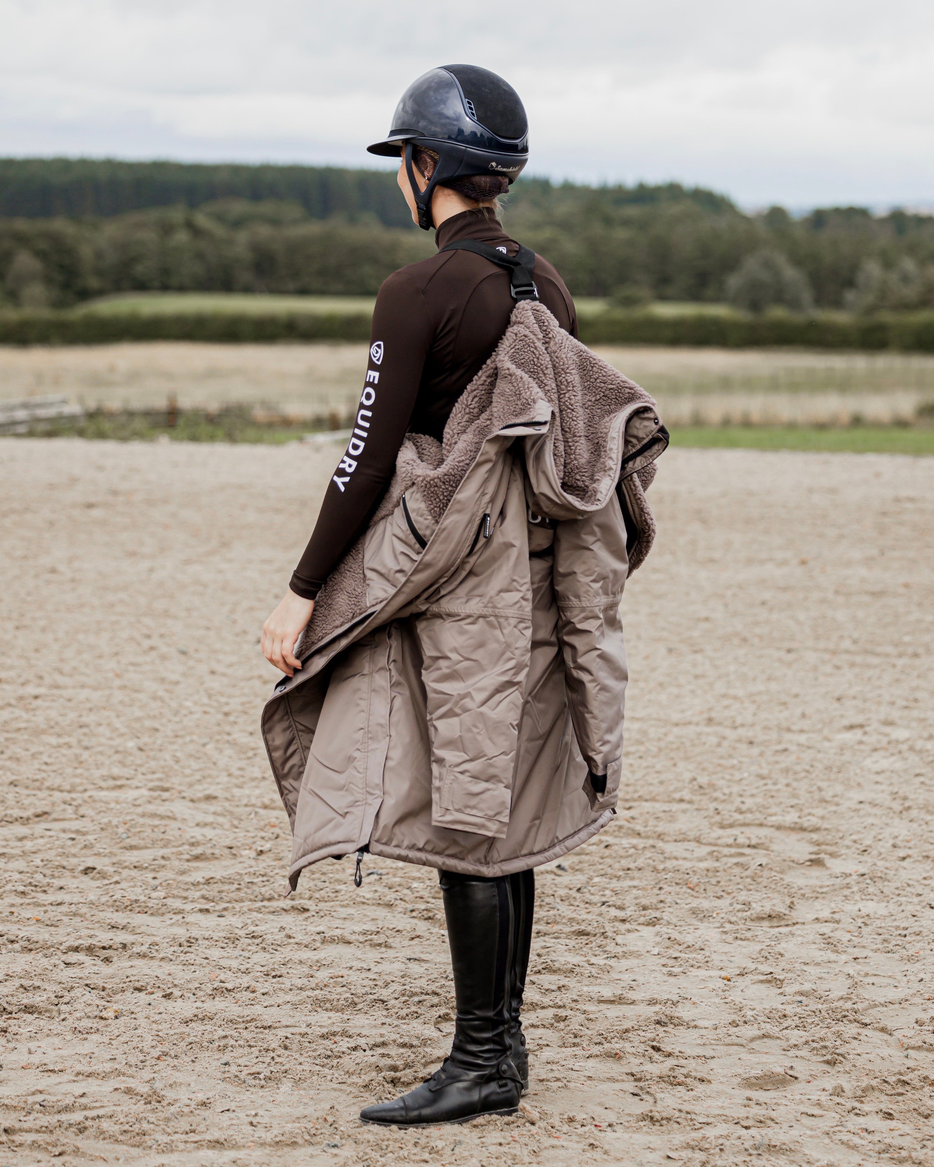 Designed to be oversized and worn full length, this performance coat boasts a remarkable 20,000mm waterproof rating, is fully breathable, fleece-lined, and layer-friendly, allowing plenty of room to comfortably accommodate a body protector.